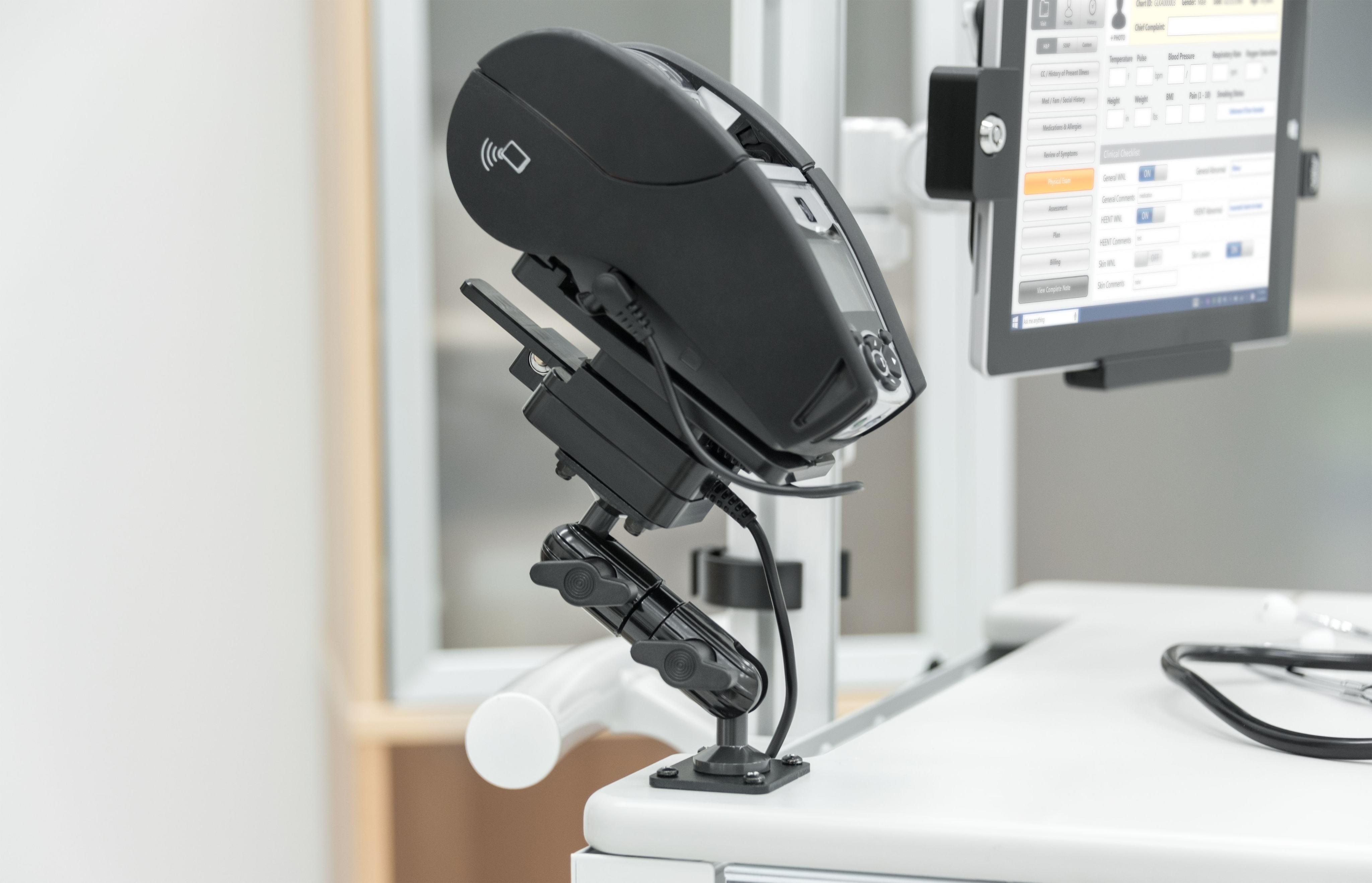 Easily mounts in vehicles, forklift, healthcare medical carts, retail carts, warehouse carts, work desks, walls and any flat surface in general