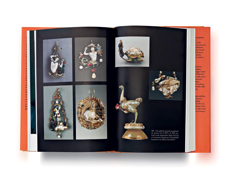 luxury with special laws,fines and taxes (which served to fatten city coffers anyway) multiplied, the growing demand encouraged the spread of fake or “processed” pearls. Leonardo himself, in the Codex Atlanticus, suggested a method for preparing a“paste made from tiny pearls,”suited to recreating larger pearls: a mix of true and false. Pure and valuable, until the end of the 18th century pearls were trustingly used as an antidote and medicine - against plague, eye afflictions, scrofula, and so on - or as a cosmetic (after all, the authors point out that anti-aging creams or tubes of whitening toothpaste containing pearl extracts are still on the market to this day). Isn’t pearl jewelry for men still commonly used nowadays? They were so in the 16th and 17th centuries, at least for rulers and aristocrats, as evidenced by the paintings depicted in the book: in particular, a keen preference for pearls was shown by the kings and gentlemen of the English court, where power and elegance were embodied in long necklaces, bulky earrings (which would be shelved with the advent of men’s wigs in the 18th century), and even opulent bandoliers.With the modern age and the great geographical explorations and discoveries of the 16th and17thcenturies,theworld“expanded”.