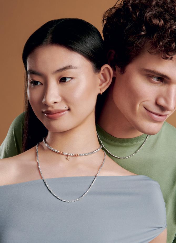 But Loro Piana’s business is not only linked to the elements mentioned above but also to the relationship with nature, a key element of luxury, which takes on an experience-based nature and a style synonymous with fun en plein air, as in next winter’s collections, which explore the hiking and outdoor world. In these collections, Loro Piana’s savoir-faire clearly shows through in the use of technical fabrics combined with finesilksandcashmere,allexpertlycraftedtowithstand the elements.Plus,another high-performance element is the introduction of an innovative membrane containing graphene, engineered by Loro Piana, featuring outstanding conductive properties and capable of evenly distributing body heat to ensure a feeling of utmost comfort. This is a reflection of the importance of technological innovation in developing one’sluxuryregardlessofthemarketandfashiontrends, creatingacompleterangeofproductsthatallowsoneto own garments that last a long time beyond the current hype. Contemporary men or women are interested in a wardrobe made up of basic, top-quality clothing to be worn every day, suggesting a more sophisticated understanding of what is synonymous with elegance and distinction.If one wants to find a lesson behind this stylethenwecanperhapsborrowafamousphrasefrom VivienneWestwood:“Buyless,choosewell,makeitlast”. This can be found in Loro Piana’s unmistakable taste for tradition and modernity also in DUO, its timeless line of costume jewelry, which represents the harmonious blend of metal and leather in chain necklaces,earrings and bracelets.The interplay of metal,satin and leather delivers an unparalleled sensory experience, creating that stunning contrast between softness and strength. The most iconic pieces include brass brooches in the