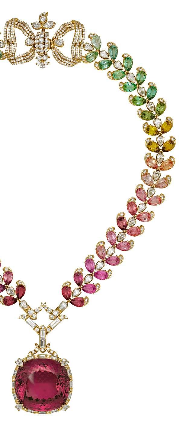 Una rappresentazione della vita e del tempo, raccontata attraverso lo scorrere delle stagioni. È proprio qui che nasce la storia del brand, quando Guccio Gucci inizia a produrre articoli in pelle artigianali nel 1921. Gucci, oggi parte del gruppo Kering, è uno dei marchi del lusso più prestigiosi al mondo. L’ingresso nel mondo dell’alta gioielleria è recente ma fin dal suo esordio la Maison ha saputo stupire e ammaliare il proprio pubblico grazie a un forte coraggio creativo e alla ricerca delle pietre più rare e straordinarie, spesso incassate in audaci silhouette e giochi cromatici. Per quest’ultima collezione, il viaggio immaginato da Gucci Allegoria inizia con la primavera e il risveglio della natura, accolto con una sorpresa e una meraviglia sempre nuove. Lo spirito spensierato di questo periodo ispira design unici, caratterizzati da colori freschi che ricordano i molteplici fiori che costituiscono l’iconico motivo Flora di Gucci. A evocare questo fermento di vita è, ad esempio, una splendida tormalina verde taglio coussin da 226 carati con incastonatura traforata, sapientemente lavorata e ornata da motivi a stella e diamanti taglio baguette, che illumina con la sua intensità la collana, la cui catena è impreziosita da diamanti e tormaline colorate. Se la primavera rappresenta il fermento della vita, l’estate ne coglie l’esplodere, trovando espressione in colori saturi, con smeraldi, spinelli e tormaline Paraiba, cosparsi di diamanti dalle molte sfaccettature. Abbinamenti inattesi e tagli audaci testimoniano la straordinaria creatività di Gucci e il suo savoir-faire. L’autunno porta con sé un cambiamento con tonalità più calde e quiete che trasmettono una delicata morbidezza, racchiusa in pietre setose e luminose, come lo zaffiro giallo, la tormalina rosa e il granato mandarino. Al centro di una delle varie collane, uno zaffiro giallo da 78 carati e una colorata serie di tormaline e diamanti.