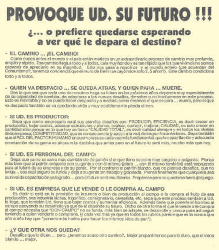 “Nuestro mensaje trató de ser siempre coherente Se basó en contribuir a que cada productor, cada empresa, cada profesional que con su trabajo apoya al campo y las agroindustrias, visualizara dónde estaba él parado y mirando la realidad de otros como él en condiciones y circunstancias similares, se fije metas desafiantes, pero posibles, para ir paulatinamente trabajando cada vez mejor y así avanzar en el camino virtuoso de la mejora continua”