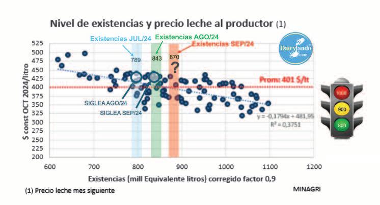 Por otra par te existe una correlación marcada entre el nivel de existencias de productos en industrias lácteas argentinas y los precios ofrecidos por la leche (gráfico 2) En ese sentido, los datos oficiales disponibles de stock muestran niveles adecuados para garantizar precios fir mes de la leche cruda
