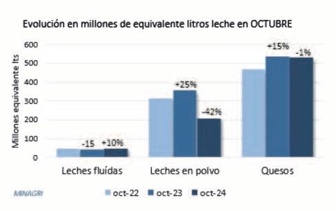 cur vas se cr uzan) En el per íodo ene-oct 2024 Argentina acumula un volumen de lácteos expor tado +13% superior al mismo per íodo 2023 Entre quesos y leche en polvo se explica el 94% de lo expor tado correspondiendo el 60% a leche en polvo y 40 % a quesos La mitad de los quesos es mozzarella El destino mayor itar io es Brasil
