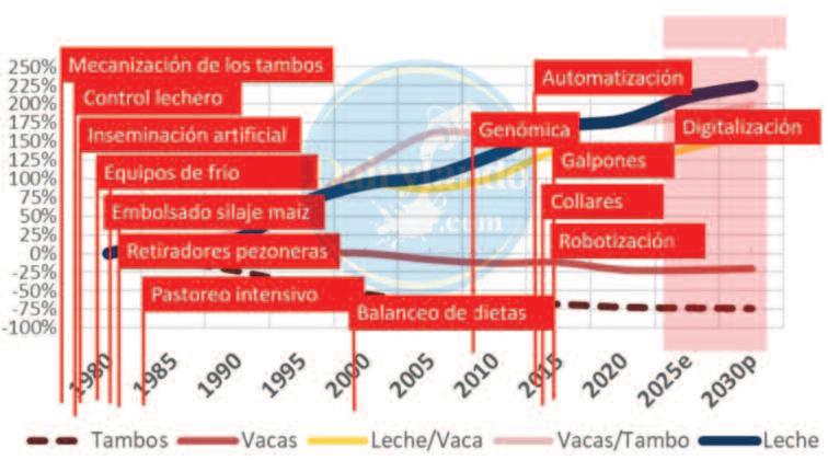 En el Gráfico 2 se han marcado las principales tecnologías que los tambos han ido incorporando en el mismo período, indicando el año aproximado en que cada una comenzó a tomar peso en la realidad del conjunto Se podrá discutir si el silaje de maíz tomó cuerpo en el 82, o un poco antes o después, o si los sistemas de vacas encerradas lo hicieron un poco antes o más tarde de 2017, pero el gran acierto del Ing Marcos Snyder, de Dairylando, es que nos muestra la evolución de los tambos y muy gráficamente presenta el continuo proceso de incorporación de tecnología y ajustes en los sistemas de producción que los productores han llevado adelante para seguir progresando porque necesitan sobrevivir