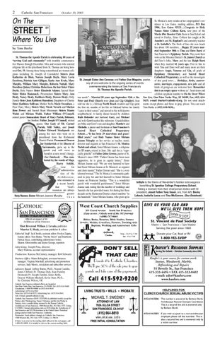Most Reverend William J. Levada, publisher Maurice E. Healy, associate publisher & editor Editorial Staff: Jack Smith, assistant editor; Evelyn Zappia, feature editor; Tom Burke, “On the Street” and Datebook; Patrick Joyce, contributing editor/senior writer; Sharon Abercrombie and Jayme George, reporters Advertising: Joseph Pena, director; Mary Podesta, account representative Production: Karessa McCartney, manager; Rob Schwartz Business Office: Marta Rebagliati, assistant business manager; Virginia Marshall, advertising and promotion services; Judy Morris, circulation and subscriber services Advisory Board: Jeffrey Burns, Ph.D., Noemi Castillo, James Clifford, Fr. Thomas Daly, Joan Frawley Desmond, Fr. Joseph Gordon, James Kelly, Deacon William Mitchell, Kevin Starr, Ph.D., Sr. Christine Wilcox, OP. Catholic San Francisco editorial offices are located at One Peter Yorke Way, San Francisco, CA 94109. Tel: (415) 614-5640 Circulation: 1-800-563-0008 or (415) 614-5638 Advertising: (415) 614-5642 News fax: (415) 614-5633; Advertising fax: (415) 614-5641 Adv. E-mail: jpena@catholic-sf.org Catholic San Francisco (ISSN 15255298) is published weekly except the Fridays after Thanksgiving, Easter, Christmas and the first Firday in January, twice a month during summer by the Roman Catholic Archdiocese of San Francisco, 1500 Mission Rd., P.O. Box 1577, Colma, CA 94014. Annual subscription rates are $10 within the Archdiocese of San Francisco and $22.50 elsewhere in the United States. Periodical postage paid at South San Francisco, California. Postmaster: Send address changes to Catholic San Francisco, 1500 Mission Rd., P.O. Box 1577, Colma, CA 94014 If there is an error in the mailing label affixed to this newspaper, call 1-800-563-0008. It is helpful to refer to the current mailing label.