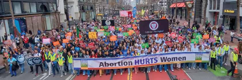 Participants in the 21st annual Walk for Life West Coast filled the plaza in front of City Hall and walked, singing, chanting and holding signs for more than a mile along Market Street to the Embarcadero, behind the Walk’s banner “Abortion hurts women.”