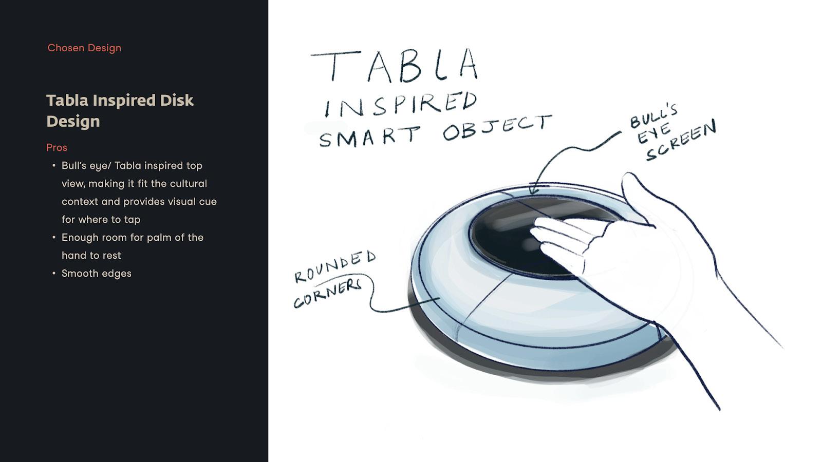 The chosen design was a “Tabla” inspired form. Tabla is a percussion instrument used in Indian classical music. This ft the cultural context as well as provided visual cues for the dancers about where to “strike”. The smooth edges also provide a way for users to rest their hand while using the object.