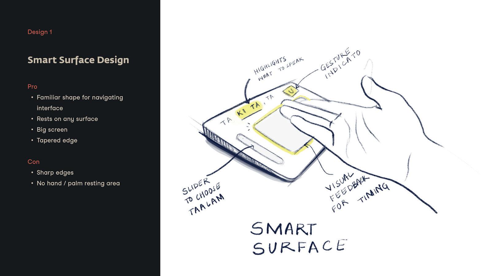 To help dancers learn the Taalam system, I imagined creating a smart object called Taalam. It would mimic a percussion instrument with a digital touch interfaces that the user can interact with.