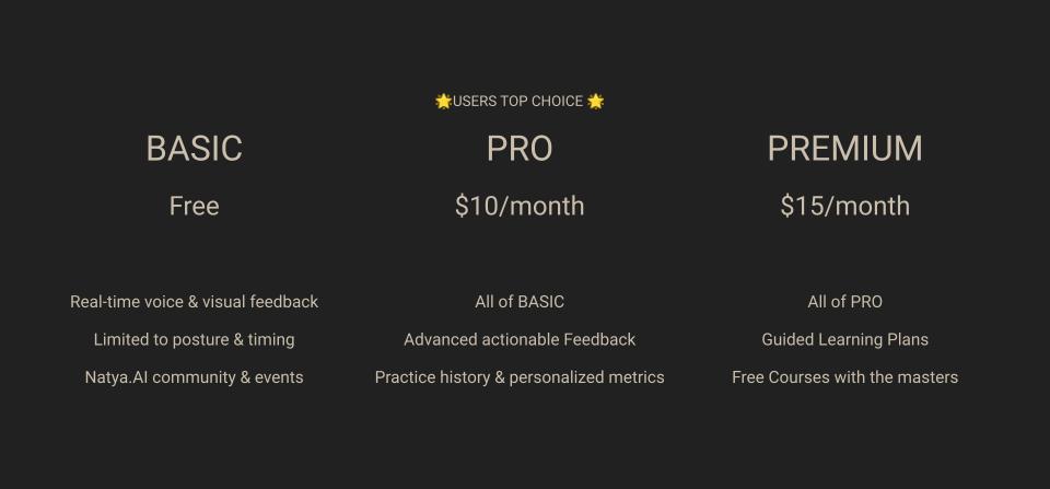 1. Basic: The free tier will provide basic features real-time voice and visual feedback on posture and timing. This ofering will also include access to Natya.AI community and events.
