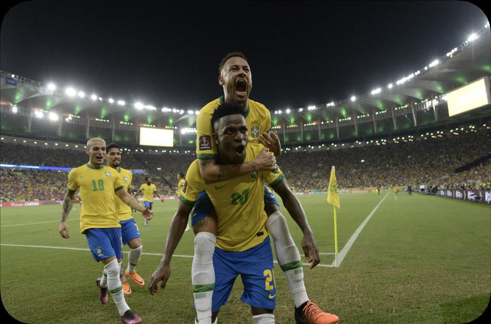 “Vini Jr. celebrating his goal for the Brazilian team along with Neymar at Maracanã stadium”