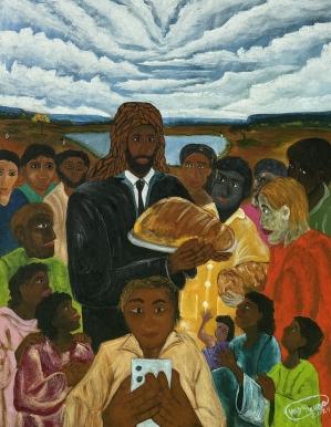 A obra uma arte contemporânea, que retrata Jesus repartindo o pão, abordandoumamensagematualsobrenossaalimentaçãosaudávelea rejeição aos alimentos transgênicos, criando, assim, um diálogo entre espiritualidade e questões contemporâneas. Isso ajuda a conectar a mensagem atemporal de Jesus com os desafios atuais. Jesus está distribuindo pães feitos com ingredientes orgânicos, enfatizando a importância de escolhas saudáveis e sustentáveis. O pão pode simbolizarnãoapenasfísico,mastambémuniãoepartilha.
