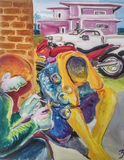 “Andando sobre as águas – Retratos da Sociedade” traz uma reflexão sobreosnossosdias,emqueoqueébeloesagradojánãotemadevida importância para a maioria das pessoas. Na obra, vemos em primeiro planodoisjovensemumbarcoque,aoinvésdecontemplaromilagreao seu redor, preferem fazer uma live e selfies para suas redes sociais. O barco sem remos simboliza o mundo em que vivem, à deriva. O rio, praticamenteseco,refleteaganânciahumana,quedesmataeincendeia as matas ciliares, destruindo as nascentes que abastecem o Pantanal. Nãohápessoasnosoutrosplanosdaobra,representandoavidaatual, em que muitos não têm tempo para apreciar o que os cerca, vivendo apenasentrecasaetrabalho,etrabalhoecasa.
