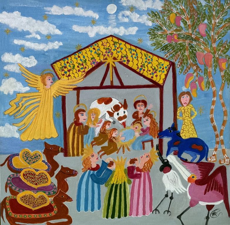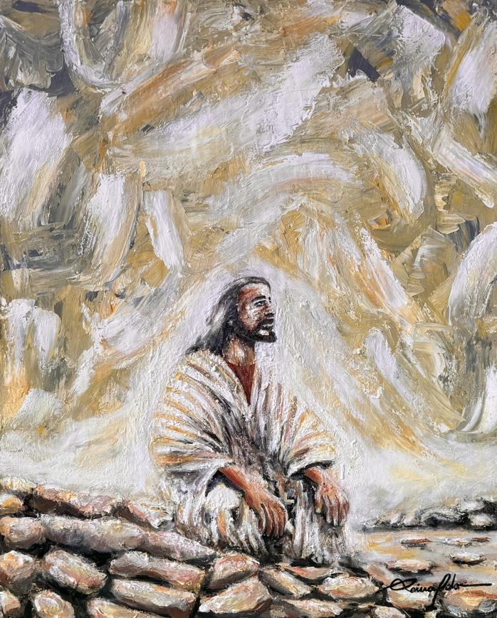 Situado a leste da Cidade Velha de Jerusalém, o Monte das Oliveiras é um local sagrado e de profundo significado para a fé cristã. Foi ali que Jesuspassoumomentosensinando,orando,chorandoporJerusalém,e ondeprofetizousuadestruiçãoefoipresoantesdeSuaascensão.Éum lugarquerefleteoamordivinopelahumanidadeeoprojetodesalvação de Deus. Segundo Lucas 22:39-53, Jesus, angustiado, orou no Monte das Oliveiras: “Pai, se for da Tua vontade, livra-me deste cálice de amargura. Contudo, não seja feita a minha vontade, mas a Tua.” Seu sofrimento foi tão intenso que seu suor caía como gotas de sangue. Na obra, no canto superior esquerdo, uma oliveira sobre um morro remete aoMontedasOliveiras.EmvezdaCidadeVelhadeJerusalém,ocanto superiordireitoretrataumafavelaoucomunidadecarente,destacandoa desigualdade social no Brasil. No canto inferior esquerdo, um menino vende doces na rua, enquanto no canto inferior direito, um homem em situação de rua pede esmolas, retratando a realidade difícil de muitas pessoas.Aocentro,Jesusérepresentadochorandolágrimasdesangue, simbolizando Seu sofrimento no Monte das Oliveiras e também pela situação da humanidade atual, que, em meio ao egoísmo, ganância e indiferença,muitasvezesdeixaosensinamentosdeCristodelado.
