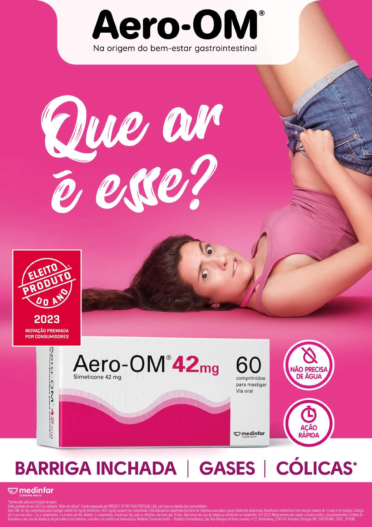 a categoria dos antiflatulentos no segmento adulto, pois sentimos que o desconforto abdominal devido à presença de gases, cólicas e a sensação de barriga inchada continuam a ser, muitas vezes, desvalorizados. Esta sensação gera um mal-estar contínuo e um dia-a-dia que poderá ficar condicionado. Agora há solução”, explica Joana Catarino, Brand Manager da Aero-OM na área Consumer Health do Grupo Medinfar. Estes comprimidos para mastigar podem ser tomados por crianças maiores de 12 anos e adultos. São de toma fácil, pois não é necessário ingerir o comprimido com água (como é habitual), e têm uma ação rápida na redução da barriga inchada, gases e cólicas.