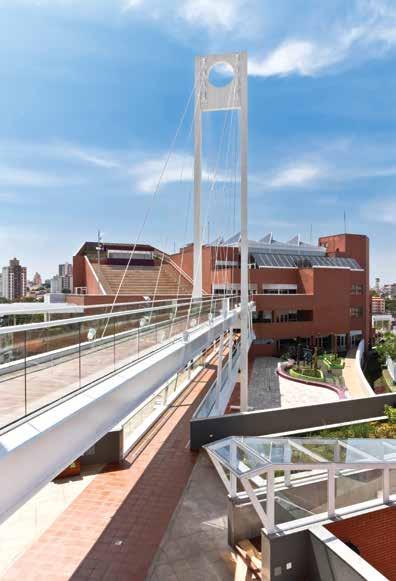 A passarela do Hospital Monte Sinai é um exemplo. Além de plasticamente elegante, trans põe duas avenidas, facilitando o acesso entre um prédio ao outro do complexo. Na mesma linha, as passarelas do Hospital HCor, em São Paulo, do Sesc Sorocaba e também a que liga o Shopping Tamboré aos demais empreendimentos da região. Em todas, uma das principais vantagens foram leveza e facilidade de montagem. Ao chegarem praticamente prontas ao local de implantação, não interferiram no tráfego diário de veículos, além da segurança pro porcionada aos transeuntes.