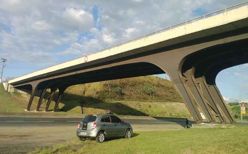 “A solução mais indicada era trabalhar com uma laje de concre to e estrutura com vigas invertidas, e por isso optamos por treliças invertidas, que agregam maior valor estético à construção”, afirma. Ao todo, os viadutos consumiram mais de 912 toneladas de aço, pintados com fundo epoxídico e acabamento em esmalte poliuretano acrílico alifático - tais revestimentos garantem alta resistência às intempéries.