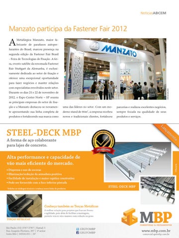 com especialistas envolvidos neste setor. Durante os dias 21 e 22 de novembro de 2012, o Expo Center Norte – SP reuniu as principais empresas do setor de fixação e a Manzato destacou-se novamen-