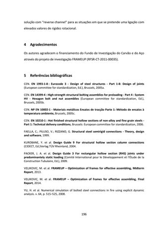 CEN. EN 1993-1-8 : Eurocode 3 - Design of steel structures - Part 1-8: Design of joints (European committee for standardization, Ed.), Brussels, 2005a. CEN. EN 14399-4 : High-strength structural bolting assemblies for preloading - Part 4 : System HV - Hexagon bolt and nut assemblies (European committee for standardization, Ed.), Brussels, 2005b. CEN. NP EN 10002-1 - Materiais metálicos Ensaios de tracção Parte 1: Método de ensaios à temperatura ambiente, Brussels, 2005c. CEN. EN 10210-1 : Hot finished structural hollow sections of non-alloy and fine grain steels Part 1: Technical delivery conditions, Brussels: European committee for standardization, 2006. FAELLA, C.; PILUSO, V.; RIZZANO, G. Structural steel semirigid connections - Theory, design and software, 1999. KUROBANE, Y. et al. Design Guide 9 For structural hollow section column connections (CIDECT, Ed.)Verlag TÜV Rheinland, 2004. PACKER, J. A. et al. Design Guide 3 For rectangular hollow section (RHS) joints under predominantely static loading (Comité International pour le Développement et l’Étude de la Construction Tubulaire, Ed.), 2009. VELJKOVIC, M. et al. FRAMEUP – Optimization of frames for effective assembling, Midterm Report, 2013. VELJKOVIC, M. et al. FRAMEUP – Optimization of frames for effective assembling, Final Report, 2014. YU, H. et al. Numerical simulation of bolted steel connections in fire using explicit dynamic analysis. v. 64, p. 515–525, 2008.