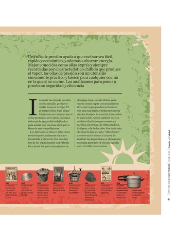 el mango-tapa. Las de última generación tienen tapas con mecanismos abre-cierra que pueden accionarse con una sola mano, y reducen todavía más los tiempos de cocción y los costos de operación. Ahora también existen modelos diseñados para usarse en parrillas eléctricas, de vitrocerámica, halógena o de inducción. Por todo esto, el comal le dijo a la olla: “¡Muy bien!”, y nosotros nos dimos a la tarea de analizar las disponibles en el mercado nacional, para que tú escojas aquella que te facilite más cocinar.