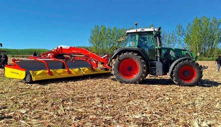 significativamente con la integración de un elevador delantero con toma de fuerza; esto significa que ahora se dispone de dos espacios de enganche independientes e inteligentes. Esta combinación puede utilizarse de forma rentable tanto en praderas como en cultivos herbáceos. Para el especialista en prados KRONE , por ejemplo, el uso de una combinación delantera-trasera mejora significativamente la eficiencia de la siega. Las primeras experiencias se obtuvieron con éxito utilizando la segadora frontal KRONE EasyCut F 320 en combinación con el tridente EasyCut B 950 Collect.