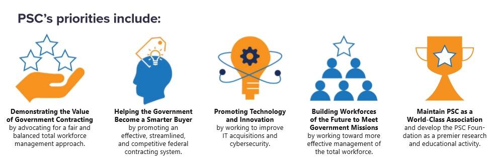 PSC's core mission is to provide policy leadership that drives an open, competitive, and thoughtful federal acquisition process. We engage with government leaders and customers to communicate our industry concerns and thought leadership. Through research, direct advocacy, collaboration, and policy recommendations, PSC is your voice on the Hill and in the agencies.