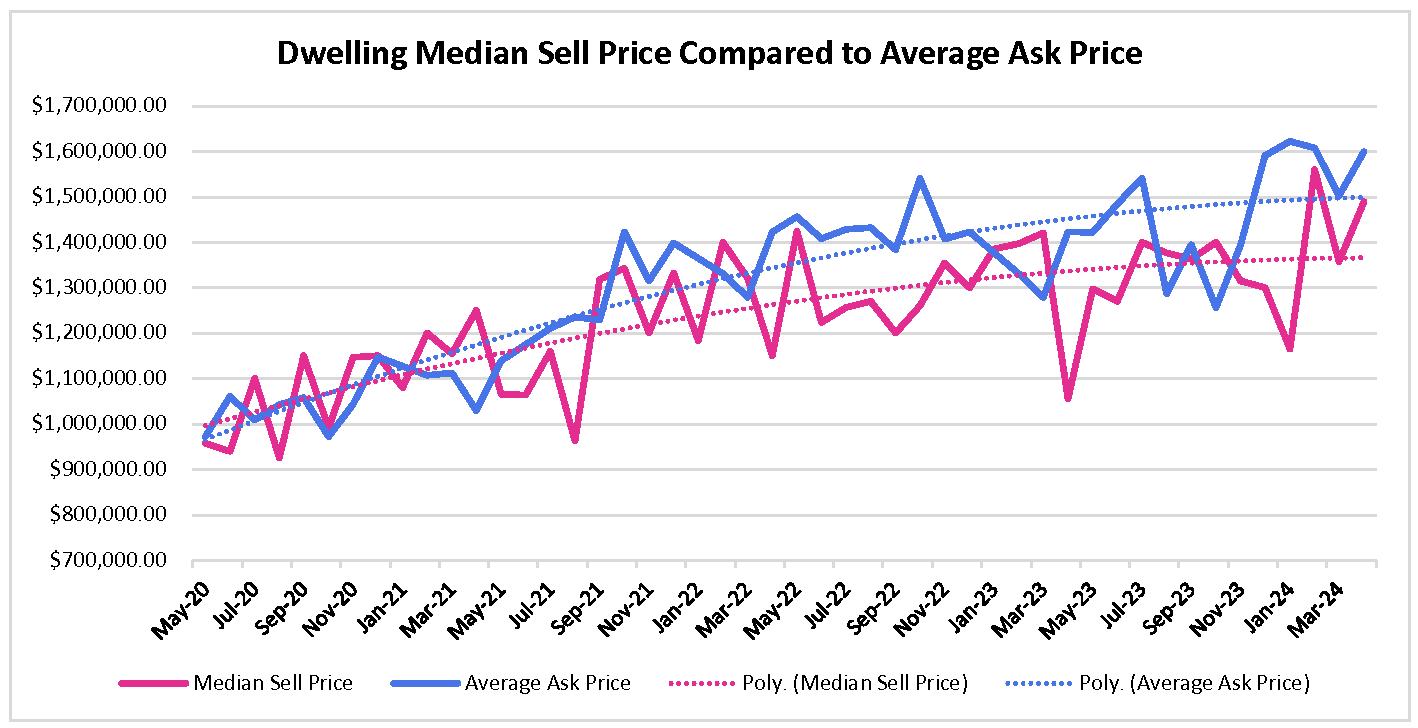 MedianSellPriceforresidentialhomesforApril2024at$1,490,000is10%upfromthe monthbefore,and42%upforthesamemonthlastyear.