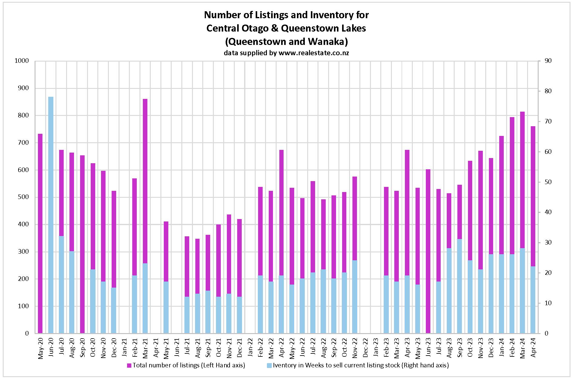 ThetotalnumberoflistingsintheQueenstown–WanakaDistrictremainatelevatedlevels butaredownfromthehighsofFebruaryandMarchto760propertiesinApril2024. Inventory,orthetimeitwilltaketosellcurrentlistingsattherateofcurrentsales,haslowered from28weeksforthepreviousmonthto22weeksforApril,indicatingabalancinginsupply anddemand.