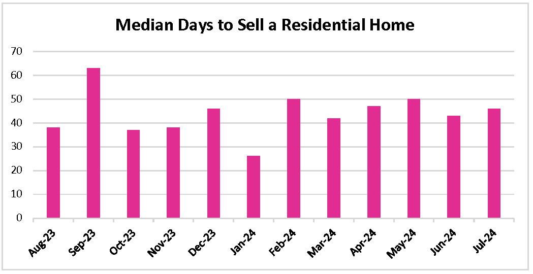 Mediandaystosellaresidentialhomeremainsrelativelystablethrough2024comparedto arelativelyvolatile2023.MediandaystosellforJuly2024isat46days,up3daysfrom June2024at43daysanddown4daysfromMay2024at50days.