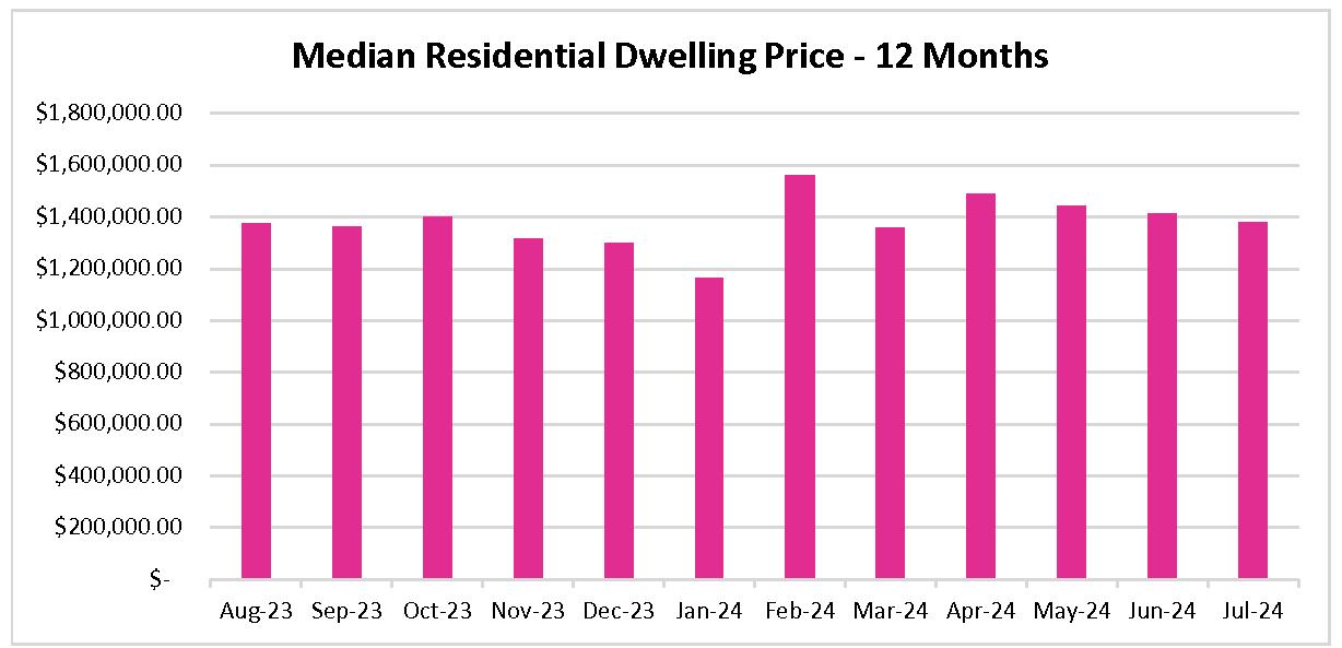 Medianresidentialdwellingsalepricehasremainedremarkablystableoverthelast12 months.Thelast4monthsrangingfrom$1,357,500to$1,490,000,withthemonthofJuly 2024recordedat$1,380,000down2.5%comparedtoJune2024at$1,412,000anddown 1.4%comparedto$1,400,000forJuly2023.