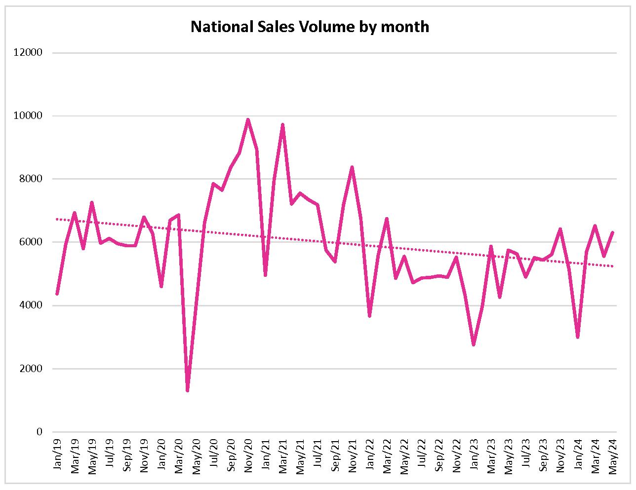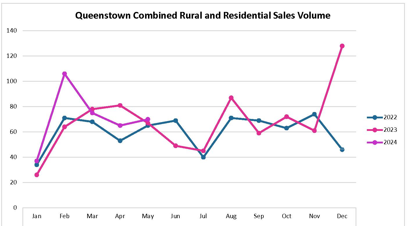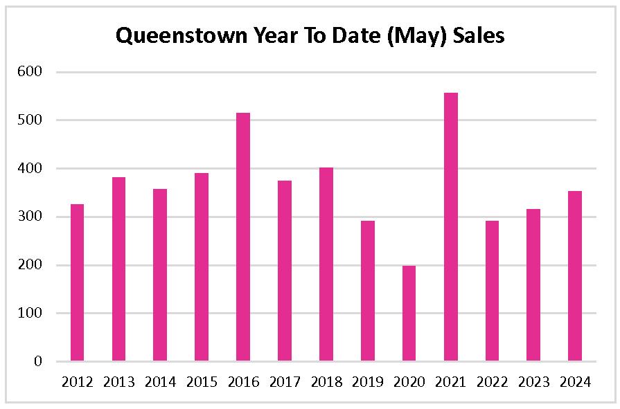 Queenstownrecorded70salesofresidentialpropertyforMay2024,some8%uponApril 2024andsome4%uponMay2023;thedownwardtrendofsalesfor2024mayhave broken.Year-to-date(May)salesforQueenstownare12%upforthesameperiod2023, and21%upforthesameperiod2022.Thisyearisofftoastrongstart,aidedwiththe releaseof41Hanley’sFarmsectionsinFebruary.