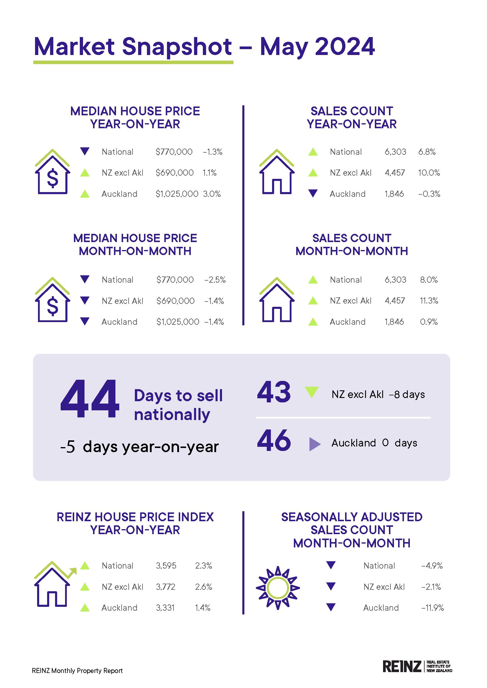 TheRealEstateInstituteofNewZealand(REINZ)monthlypropertyreportstatesthatthe May2024datashowsanationalandregionalincreaseinlistingsandsalescountswhile mediansalespricesstabilize. [REINZReport]