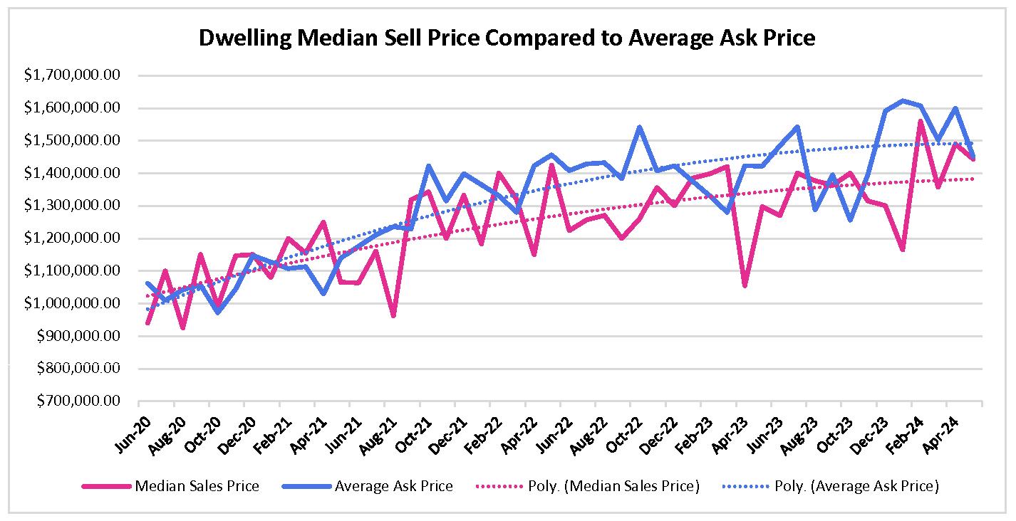 Theresidentialhomemediansalepricemaintainsastablebandoverthelast18months andhasbeenconsistently$1,350,000to$1,450,000forthelastfourmonths.May’s medianresidentialhomesalepriceis$1,443,000,11%upfromMay2023at$1,297,500.