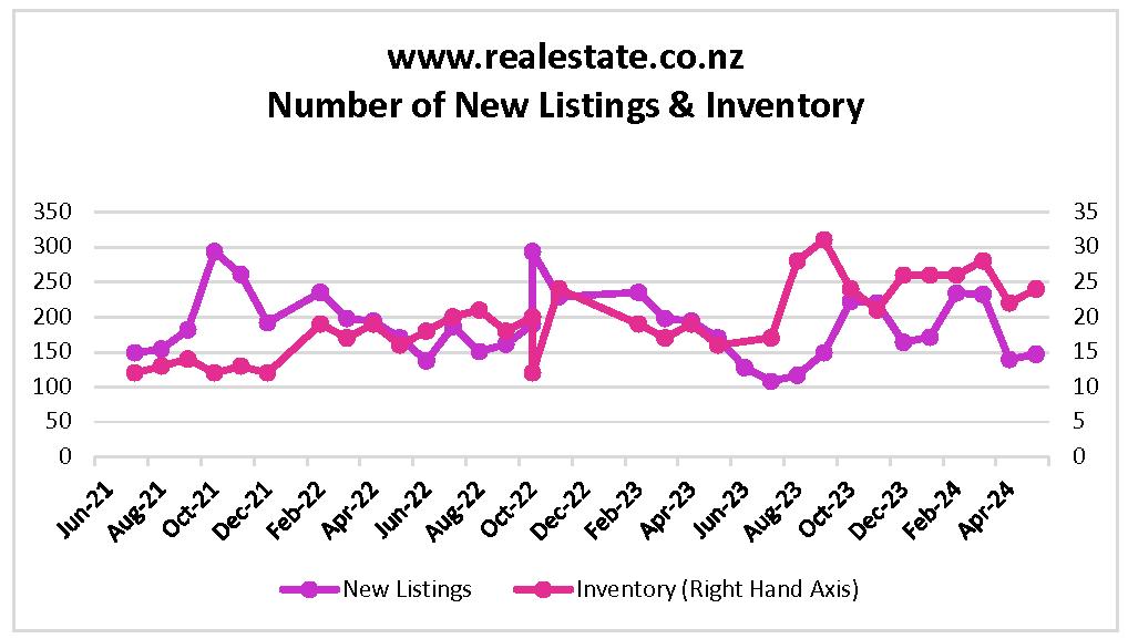 AverageAskPriceaspublishedby www.realestate.co.nz,likemedianprice,isrelatively stablefromDecember2023toApril2024runningintheband$1,500,000to$1,600,000, buttherehasbeenadropofsome9%fromApril2024toMay2024at$1,450,755.