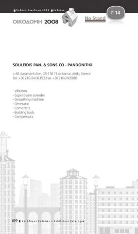 SOULEIDIS PAN. & SONS CO - PANDONITIKI > 66, Karamanli Ave., GR-136 71 Acharnai, Attiki, Greece Tel.: +30 210/24.06.153, Fax: +30 210/2405888 - Vibrators. - Super beam screeder. - Smoothing machine. - Generator. - Converters. - Building tools. - Compressors.