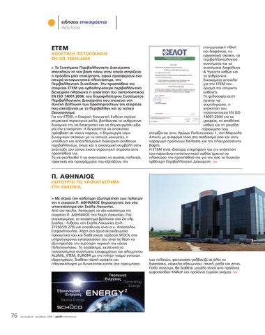 επιχειρησιακή ηθική και διαφάνεια, τις εργασιακές σχέσεις, τα περιβαλλοντολογικά συστήματα και τα συστήματα Ασφάλειας & Υγιεινής καθώς και τα ανθρώπινα δικαιώματα αποτελεί για την ΕΤΕΜ τον ορισμό της εταιρικής ευθύνης. Τη φιλοσοφία αυτή έρχεται να συμπληρώσει, η απόκτηση του πιστοποιητικού ΕΝ ISO 14001:2004 για τα γραφεία, τις αποθήκες καθώς και τη μονάδα παραγωγής που στεγάζονται στην Ηρώων Πολυτεχνείου 1, στη Μαγούλα Αττικής με αναφορά τόσο στο σχεδιασμό όσο και στην παραγωγή προϊόντων διέλασης και της ηλεκτροστατικής βαφής. Η ΕΤΕΜ είναι ιδιαίτερα υπερήφανη για την απόκτηση του παραπάνω πιστοποιητικού καθώς έρχεται να πλαισιώσει την προσπάθειά της για την όσο το δυνατόν ορθότερη Περιβαλλοντική Διαχείριση. >>