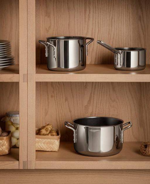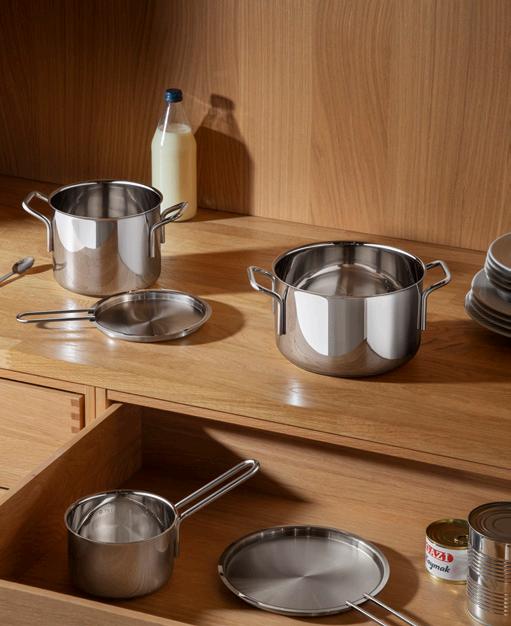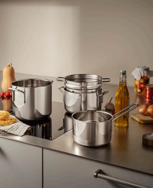Seriens genistreg er de faste mål. Alle dele kan kombineres og stables. Grydelåget passer til pastaskålen, pastaskålen kan stables oven på dørslaget, osv. Det betyder flere fordele med færre dele. Som noget nyt fremstilles gryder og pander hovedsageligt af genbrugsmetaller.