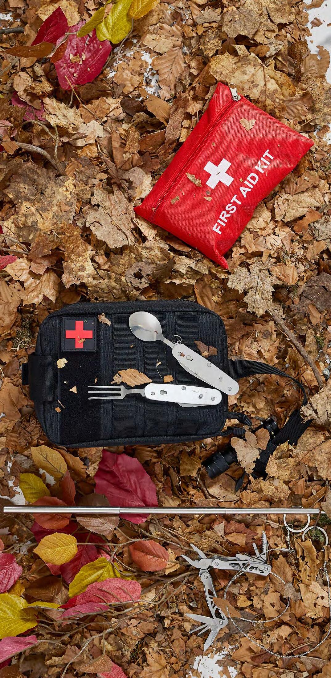 INNEHÅLL: Multifunktionsverktyg & tång, första hjälpen-kit, tändstål, ficklampa, visselpipa, fiskeredskap, rep, vajersåg, regnponcho, nödfilt, bältesskärare med glaskross.