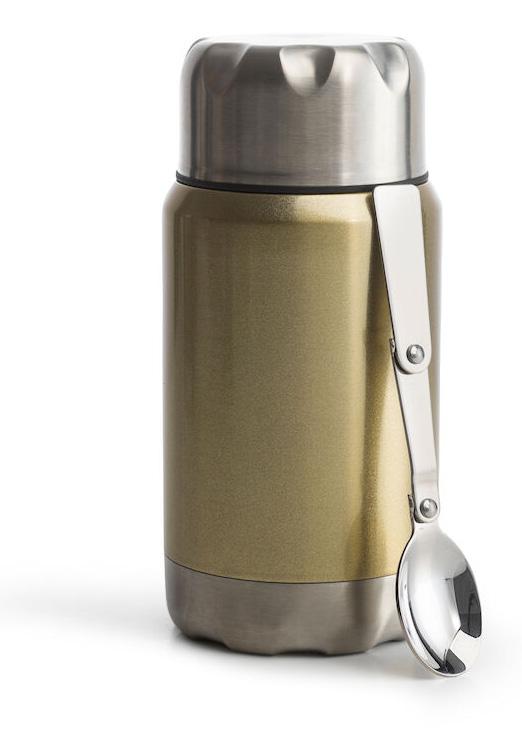 En hendig mattermos i stilig design med det lille ekstra. Det ytre lokket fungerer også som et krus/skål. Det indre lokket rommer en liten, sammenleggbar skje og kan også åpnes for å oppbevare tilbehør/krydder. Den store halsen gjør den enkel å fylle og rengjøre. Konstruksjon med doble vegger i rustfritt stål og kobberbelegg sørger for at maten holdes kald i 24 timer eller varm i 12 timer. Kommer i grønn, sort og gull.