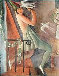 A obra A Estudante, pintada em 1915, retrata uma mulher sentada, com o rosto com leves deformações, em uma cadeira voltada para o observador, com corpo levemente inclinado para frente.