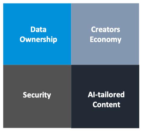 • Identity: where the users is in controls of his own data and can decide whether to keep them secret or to monetize them. In the web3, each users connects his own