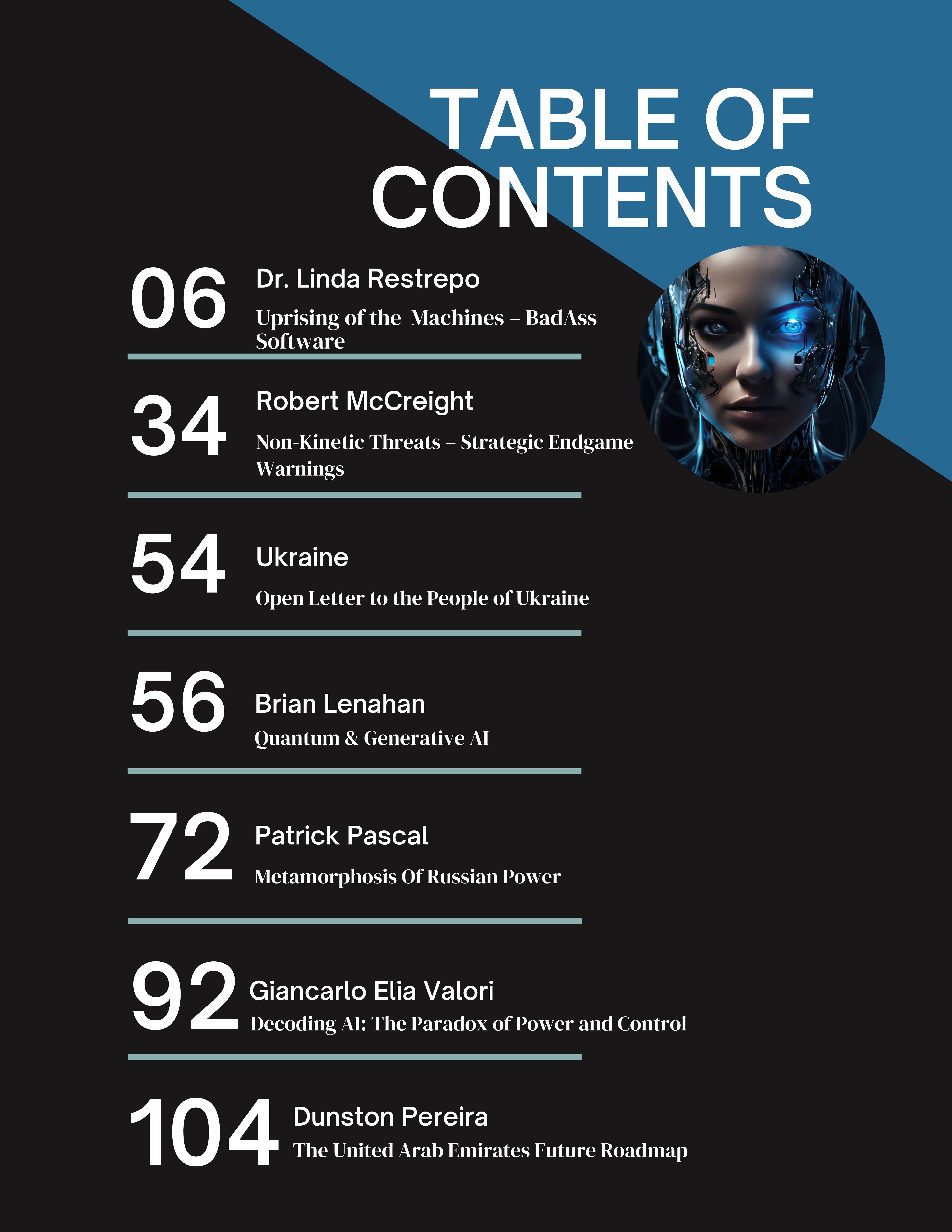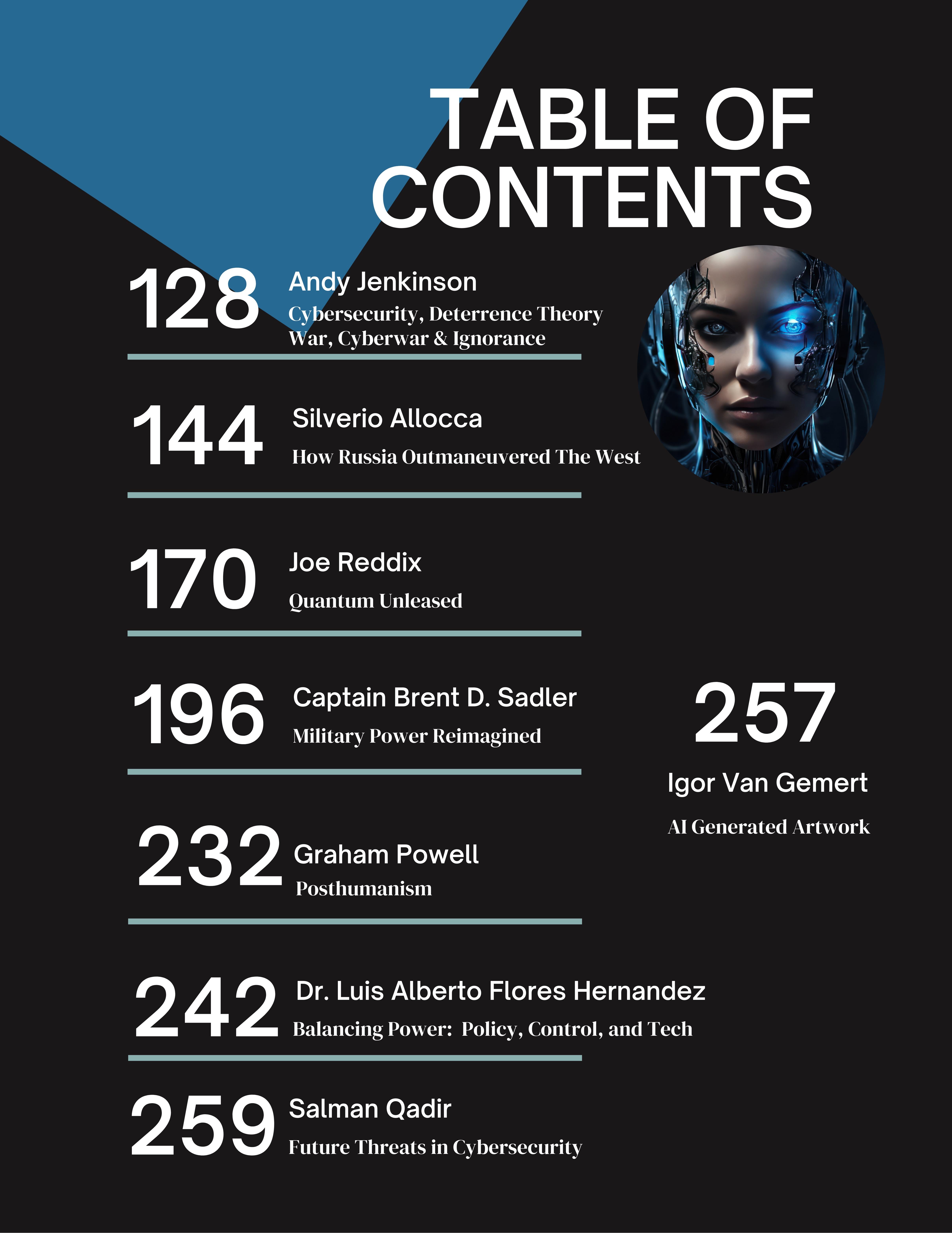 DISCLAIMER: This Magazine is designed to provide information, entertainment and motivation to our readers. It does not render any type of political, cybersecurity, computer programming, defense strategy, ethical, legal or any other type of professional advice. It is not intended to, neither should it be construed as a comprehensive evaluation of any topic. The content of this Presentation is the sole expression and opinion of the authors. No warranties or guarantees are expressed or implied by the authors or the Editor. Neither the authors nor the Editor are liable for any physical, psychological, emotional, financial, or commercial damages, including, but not limited to, special, incidental, consequential or other damages. You are responsible for your own choices, actions, and results