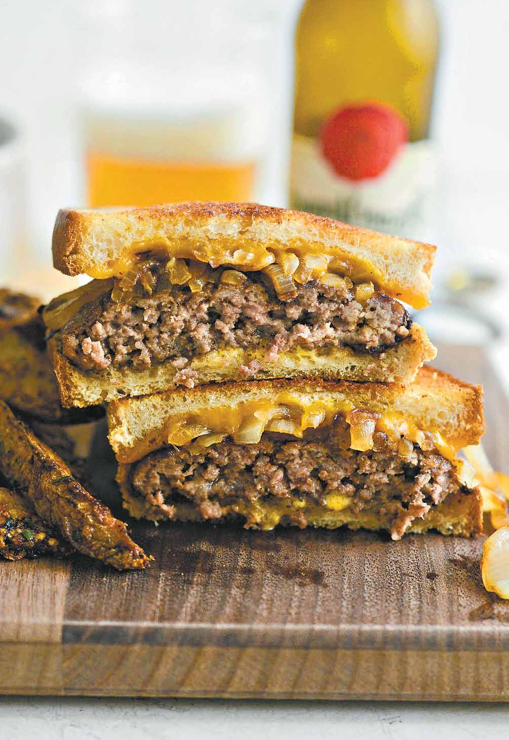 Once the cheese starts to melt and the bread is only lightly golden, top one slice of bread with a beef patty and divide the caramelized onions over each one.
