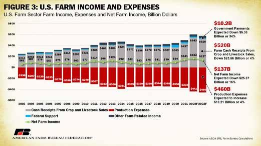 $162.7 billion in 2022 to $136.9 billion in 2023, a decrease of 16%. Much of the forecasted decline in 2023 net farm income is tied to lower crop and livestock cash receipts, continued increases in production costs and a decrease in ad hoc government support, resulting in an overall decrease of forecast net farm income. It is important to highlight the early nature of this forecast.