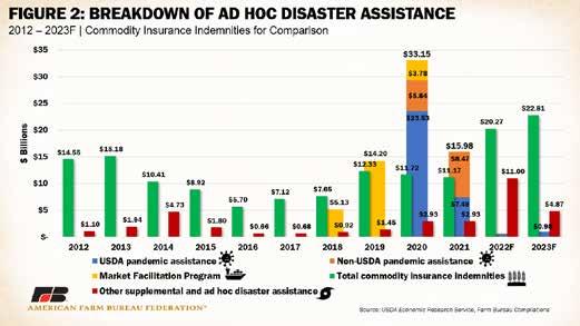the ERP program, which is currently in open enrollment through June 2. In Figure 2, total commodity insurance indemnities, which are triggered in the event of revenue or yield loss for growers who have purchased crop insurance, are not direct government payments but are included for comparison (and illustrate the importance of these vital risk management options). Commodity insurance indemnities are expected to increase in 2023 by 12.5%, or $2.5 billion, moving from $20.2 billion to $22.7 billion, marking the highest payout of indemnities since the data series began in 2005. This increase is the likely result of increased crop insurance enrollment by those who received a WHIP+ payment and are required to purchase crop insurance or Noninsured Crop Disaster Assistance Program coverage (when crop insurance is not available) for the next two available crop years– a requirement of ERP also.