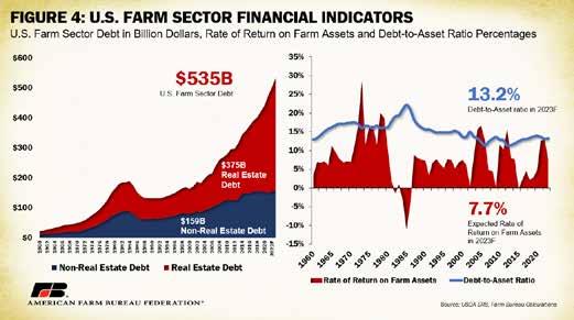 Figure 4 highlights the U.S. farm sector debt, the debt-to-asset ratio and the rate of return on farm assets.