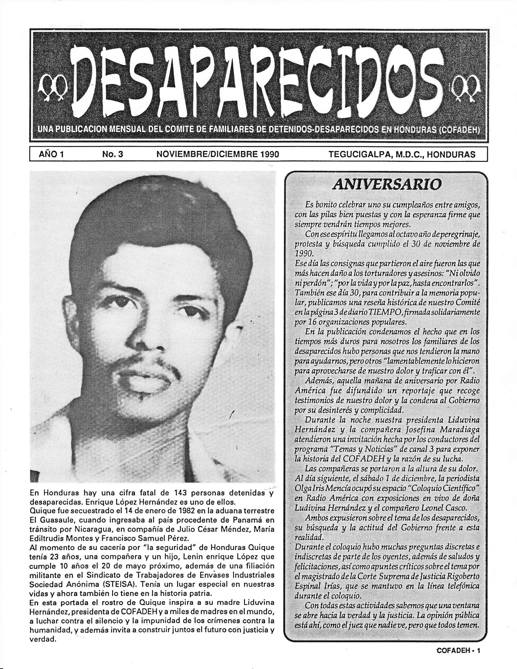 TEGUCIGALPA, M.D.C., HONDURAS desaparecidas. Enrique López Hernández es uno de ellos. Quique fue secuestrado el 14 de enero de 1982 en la aduana terrestre El Guasaule, cuando ingresaba al país procedente de Panamá en tráns¡to por Nicaragua, en compañía de Julio César Méndez, María Ed¡ltrudis Montes y Franc¡sco Samuel Pérez. Al momento de su cacería por "la seguridad" de Honduras Ouique tenía 23 sños, una compañera y un hijo, Lenin enrique López que cumple 10 años el 20 de mayo próximo, además de una filiación militante en el S¡nd¡cato de Trabajadores de Enváses Industriales Sociedad Anónima (STEISA). Tenía un lugar especial en nuestras vidas y ahora también lo tiene en la historia patria. En ests portada el rogtro de Ouique inspira a su madre Liduvina Hernández, presidenta de COFADEH y a miles de madres en el mundo, a luchar contra el silencio y la impunidad de los crÍmenes contra la humanidad, y además invita a constru¡r juntos el futuro con just¡cia y verdad.