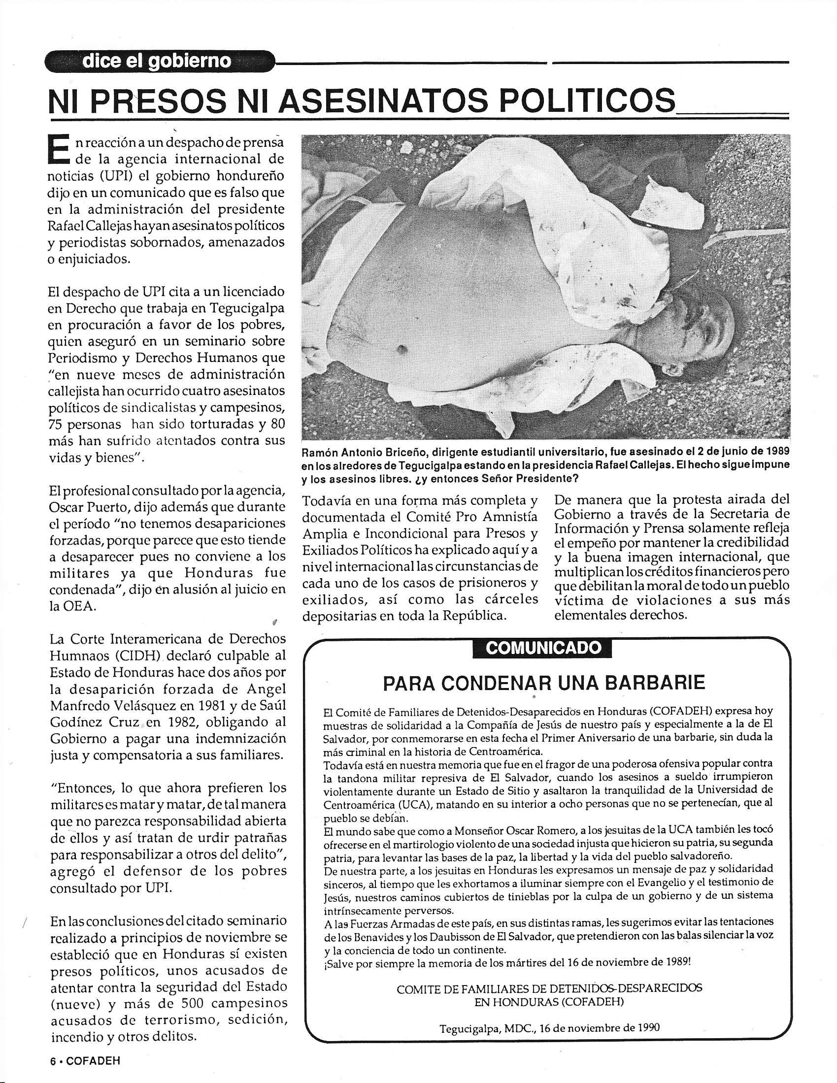 EI COFADEH señaló con dureza la terquedad estudiada del gobierno de Callejas que insiste en negar violaciones a derechos humanos durante su mandato.