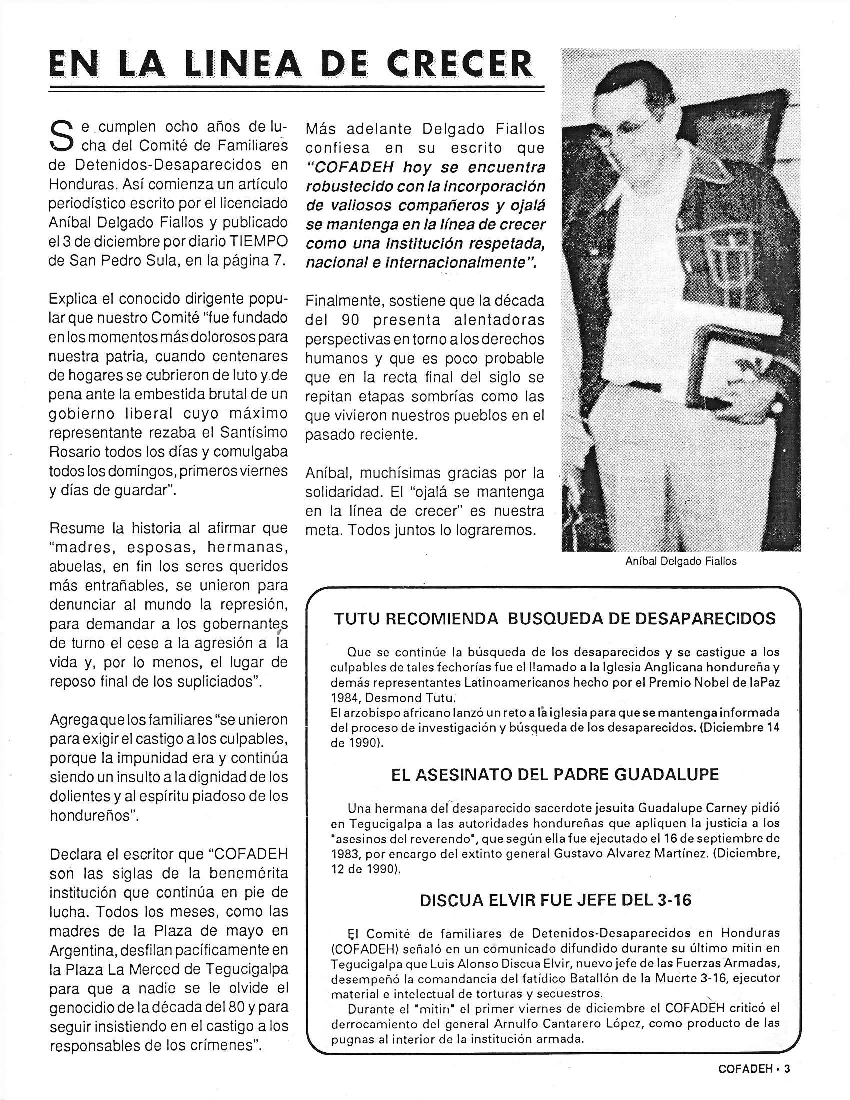 e cumplen ocho años de lucha del Comité de Familiares de D eten idos- D esaparecidos en Honduras. Así comienza un artículo periodístico escr¡to por el I¡cenciado Aníbal Delgado Fiallos y publicado el 3 de diciembre por diario T¡E[/PO de San Pedro Sula, en la página 7.