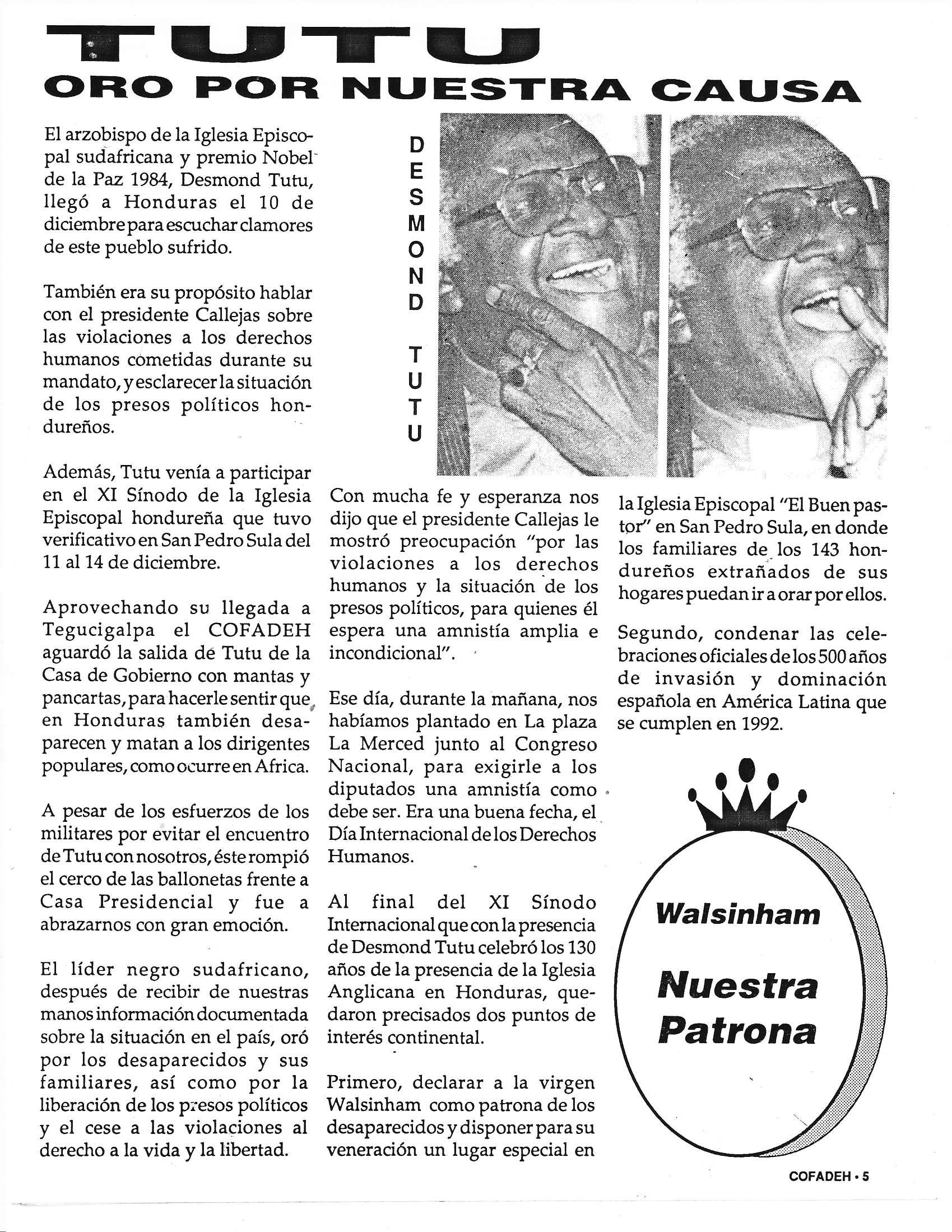 Que se continúe la búsqueda de los desaparecidos y se castigue a los culpables de tales fechorías fue el I!amado a la lglesia Anglicana hondureña y demás representantes Latinoamericanos hecho por el Premio Nobel de laPaz 1984, Desmond Tutu.