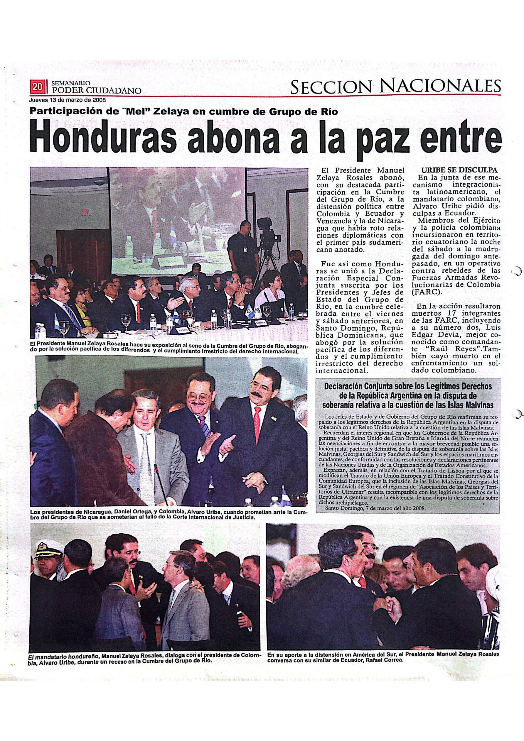 Honduras abona a la paz entre Colombia y Ecuador P. 20